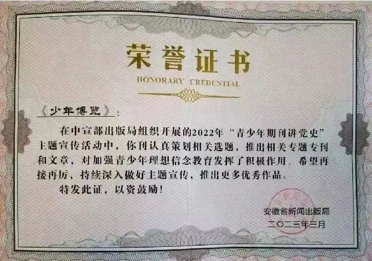 在中宣部出版局组织开展的2022年“青少年期刊讲党史”主题宣传活动中,《少年博览》推出一批有分量的专题专刊和文章,对加强青少年理想信念教育发挥了积极作用,受到中宣部出版局的肯定,并获得安徽省新闻出版局颁发的荣誉证书。