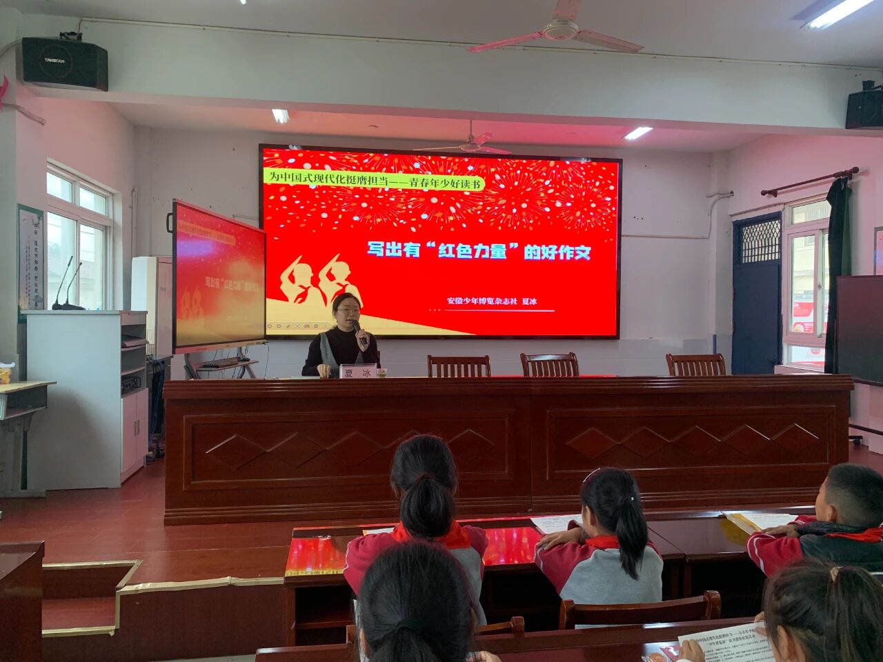 在芜湖市六郎小学的活动现场,《少年博览》编辑部主任夏冰以“写好有红色力量的作文”为题,用《少年博览》刊登的宣传党的光辉历史、弘扬爱党爱国精神的优秀文章为例,进行红色主题宣讲,并拆解背后阅读与写作的底层逻辑。“阅读不是‘完成任务’,而是与作者对话、与世界共鸣;写作也不是‘凑字数’,而是把心里的故事、眼里的光芒写出来。”