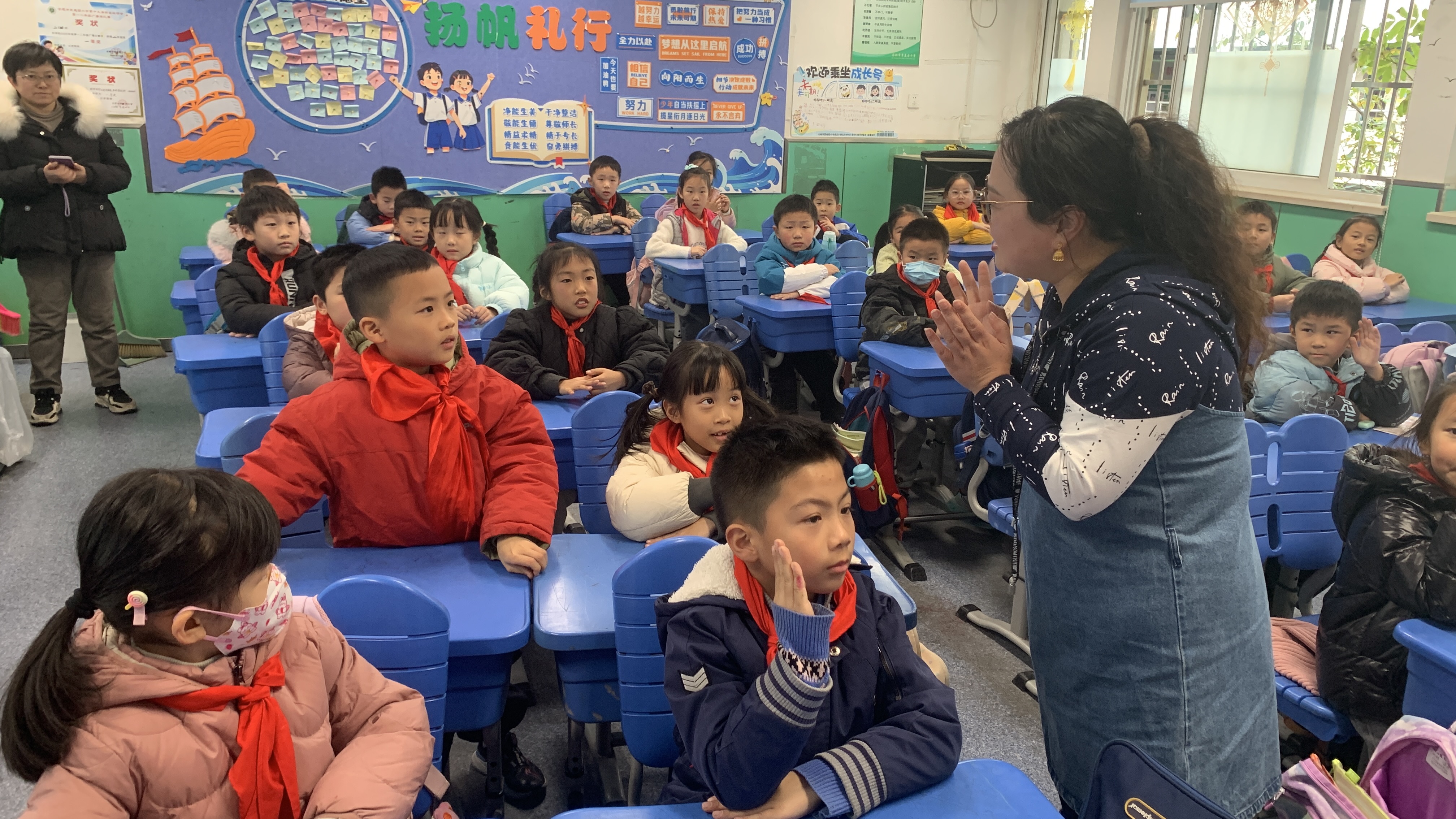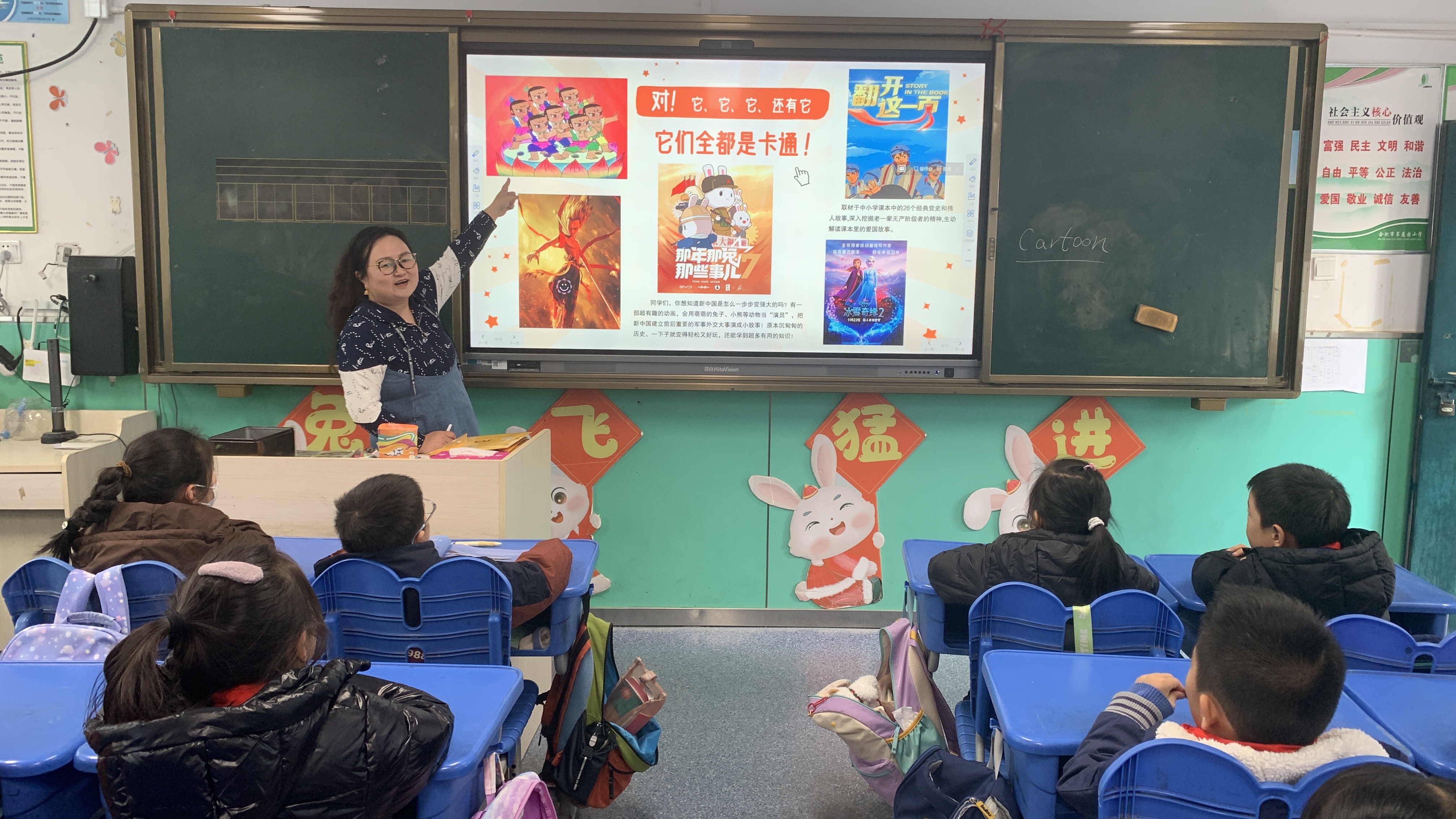 面对二年级的学生,来自安徽省少先队队刊《少年博览》,曾设计安徽公安及交警卡通形象、第四届全国体育大会吉祥物的宣讲老师从贴近孩子认知特点的“卡通片”“美术片”入手,分享不同形式、载体的美术作品,进一步培养审美意趣。同时宣讲老师以《翻开这一页》《那年那兔那些事儿》这些爱国主义题材的优秀动画作品为例,自然接入红色宣讲主题,以孩子们听得懂的趣味表达,在优秀的文艺作品中加深他们对党的历史的了解,让孩子们心中的“闪闪红星”更加闪耀。